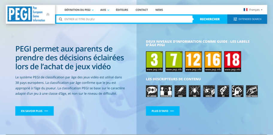 PEGI (Pan European Game Information) est le système européen de classification par âge des jeux vidéo. Il aide les enfants, les adolescents et les parents à choisir des jeux adaptés, en indiquant l’âge minimum conseillé (3, 7, 12, 16 ou 18) et les types de contenus présents (violence, langage, peur, etc.)